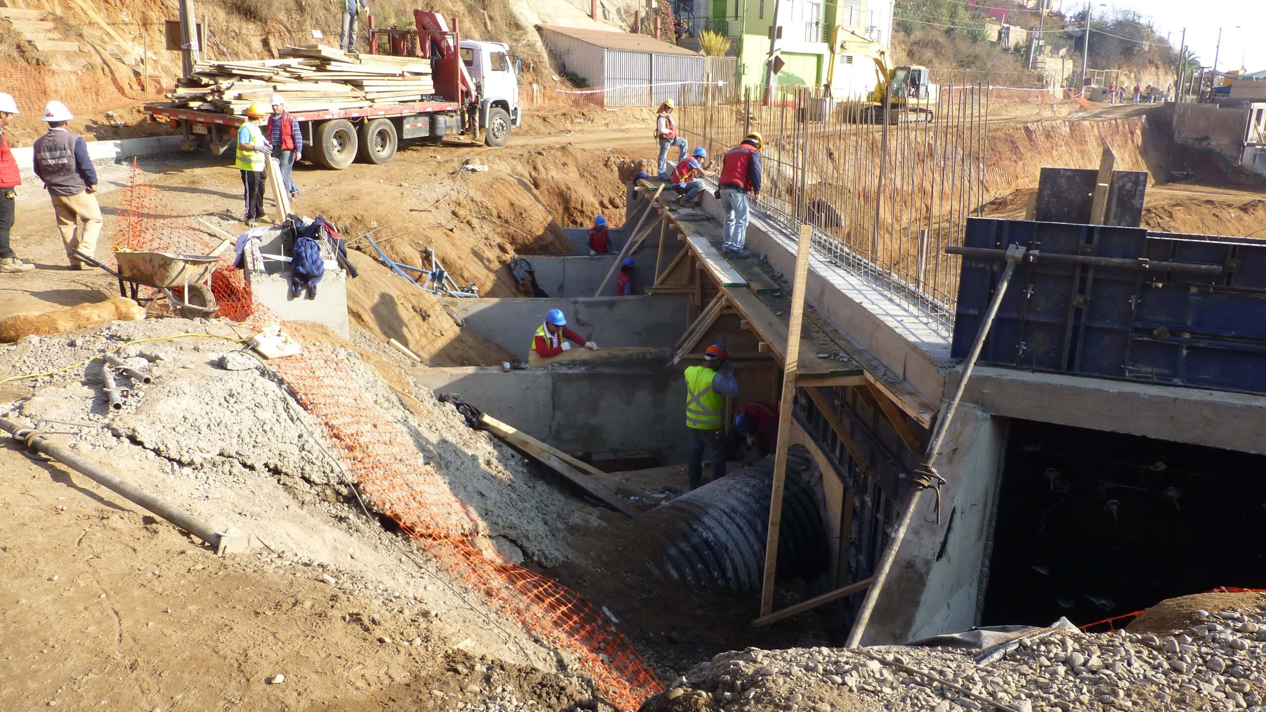 Estructuración: Muros de contención de altura variable entre 3 y 6 metros. Sistema de muro pantalla con estabilización por empuje pasivo. Esta estructuración es ideal para grandes excavaciones que permiten colocar una pantalla pasiva al lado opuesto de la calle, unida por un tirante de hormigón armado a una pantalla activa, que recibe el empuje activo y que requiere una fundación menor, sólo para equilibrar cargas gravitacionales. Cálculo realizado en conjunto con BenSal.
